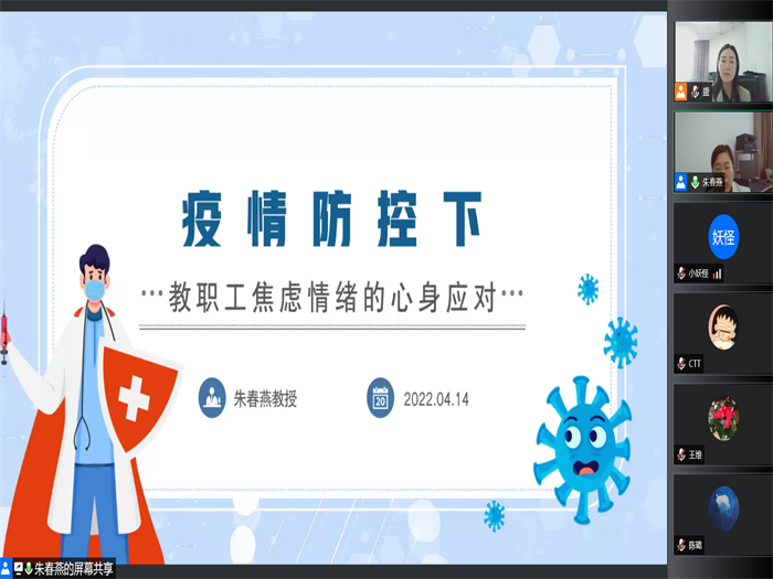 4月14日,校教职工心理健康服务中心邀请新澳门六合彩资料论坛 副院长朱春燕教授,以“疫情时期的焦虑情绪应对”为主题,为全校职工开展了一场线上公益讲座,提醒广大教职工做好“心理防疫”。全校500余名教职工线上参加活动。