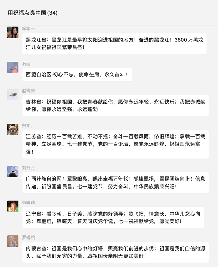 为庆祝中国共产党建党100周年,研究生团总支在微信群中举办线上团日活动, 参加的34位同学代表我国34个省级行政区,向党献上了最诚挚的祝福。