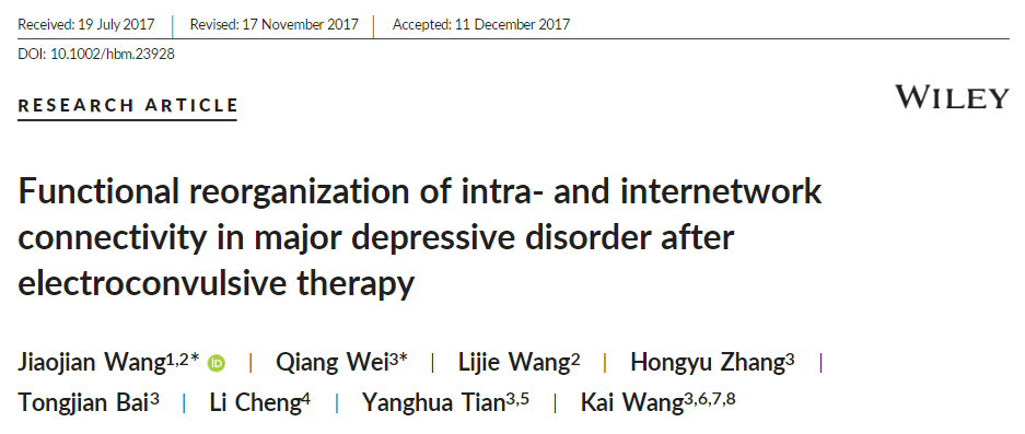 新澳门六合彩资料论坛 院长汪凯教授、田仰华教授课题组联合中国电子科技大学王骄健教授课题组关于发现电休克治疗对抑郁症患者大脑网络的调节作用入选Human Brain Mapping高被引论文。该研究不仅发现电休克可调节网络内部的连接,亦可调节网络间以及重要节点间的连接,抑郁症患者经电休克治疗后症状的改善和这些网络的调节密切相关。该研究为理解抑郁症的机制、电休克治疗抑郁症的机制提供新思路。