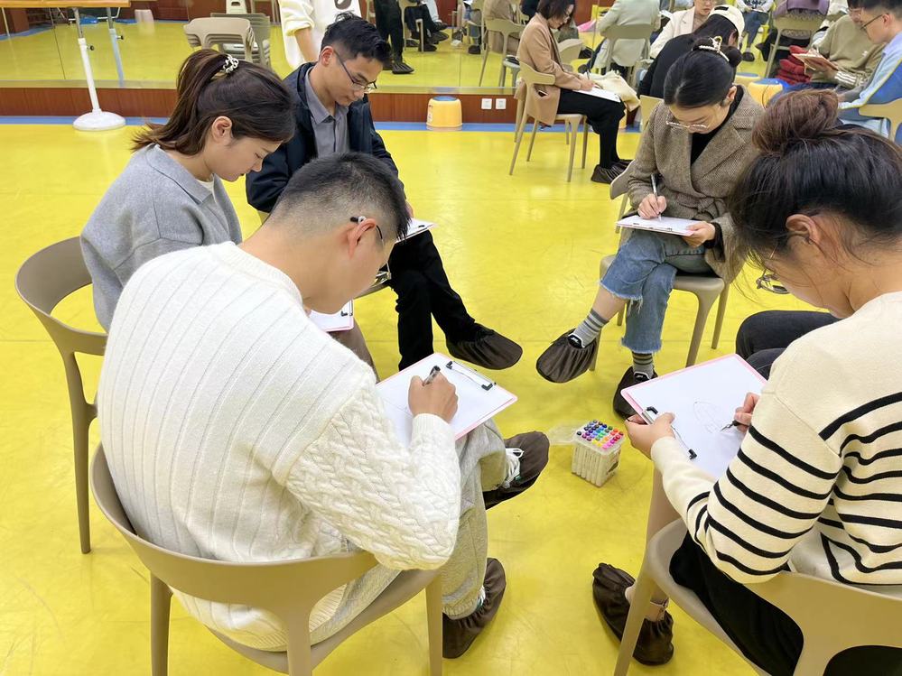 随后,通过冥想绘画出“雨中人”在自己脑海中的形象,来分析了解辅导员面临的压力大小,以及在面对压力时,自己是否有能量去抗住压力。专业的解释,让辅导员老师们频频点头认可。绘画结束后,通过小组交流,分享自己正在经历的压力和已经经历过的压力,以及自己能够有效地缓解压力的方法。辅导员分别从运动、饮食、认知调整等角度来分享自己应对压力的方法,互相学习,受益匪浅。